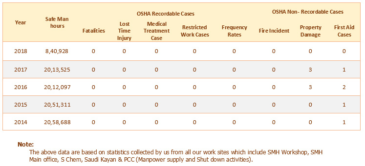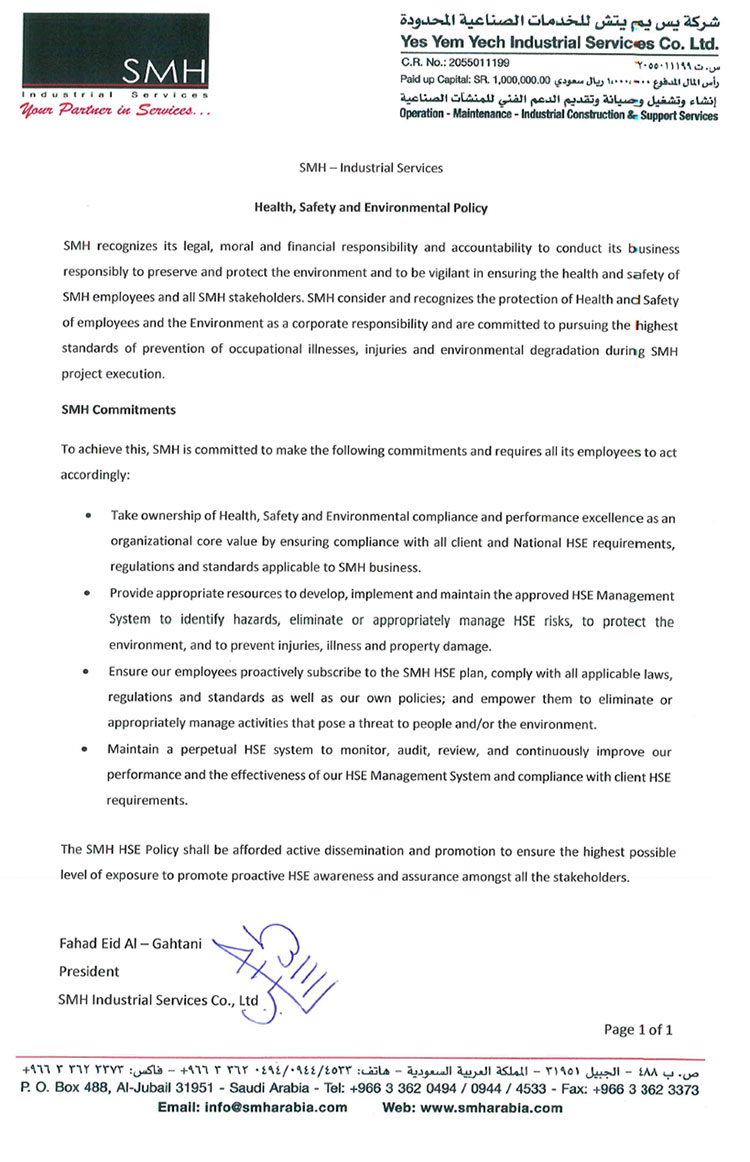 SMH recognizes the protection of Health and Safety of employees and the Environment as a corporate responsibility and is committed to pursuing the highest standards of prevention of occupational illnesses, injuries and environmental degradation during SMH project execution.